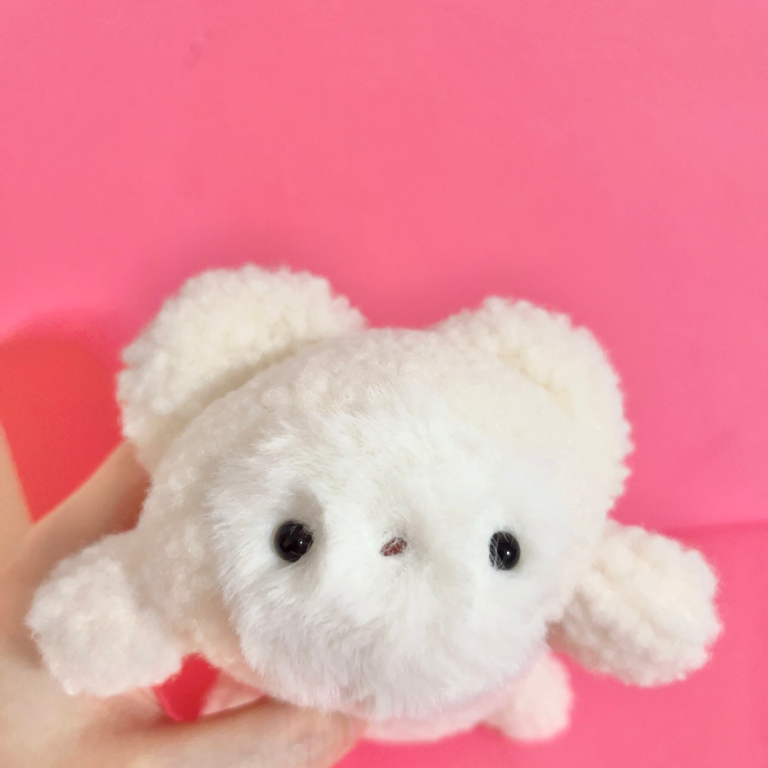 丸くてもこもこのつみれちゃんは、からだはもこもこ生地、お顔は触り心地も優しい毛足1cmのフェイクファーを使用して全て手縫いで作っています。